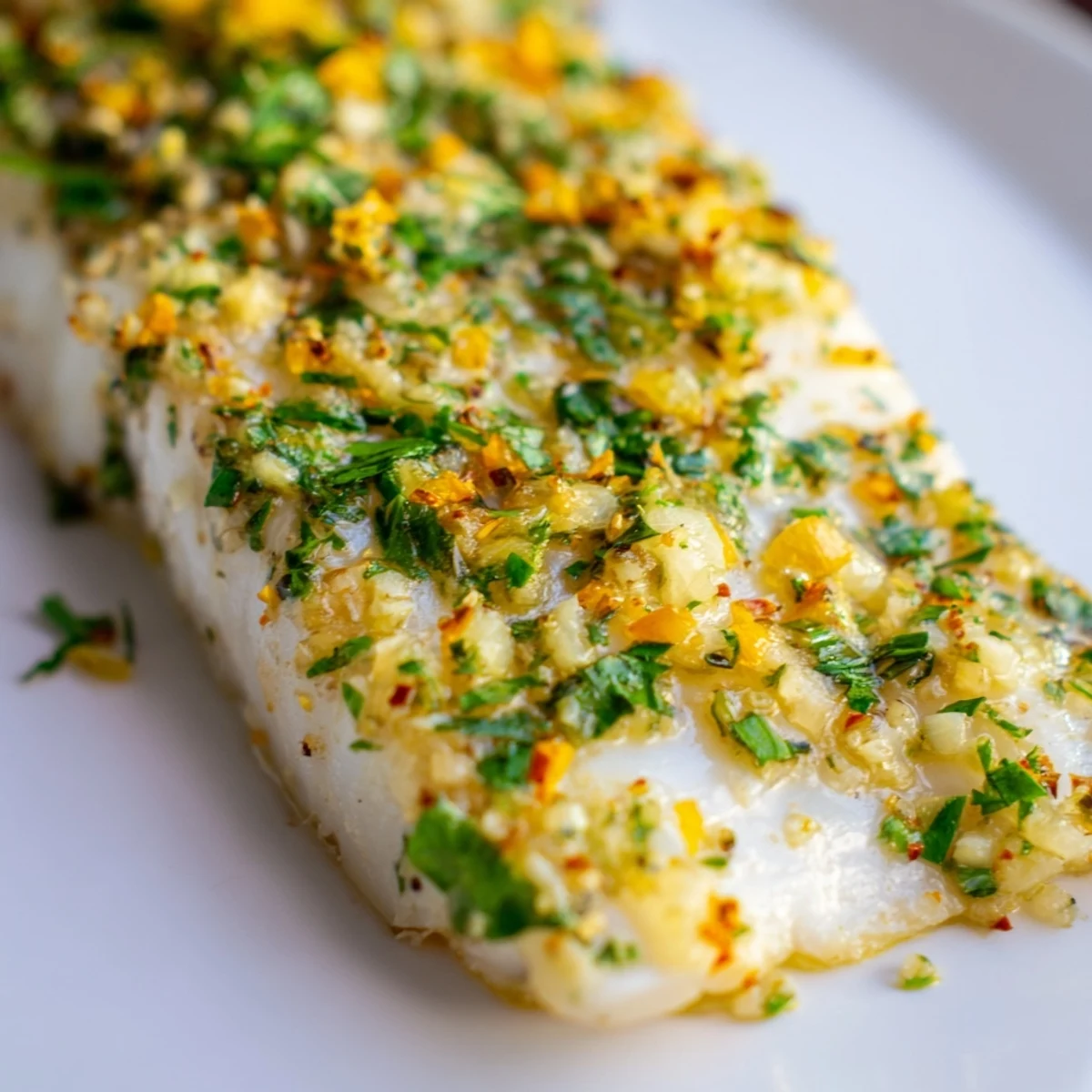 Create tender halibut fillets with a vibrant garlic-herb topping. Preheat your oven to 200°C (400°F) and ready a baking dish. Season halibut with olive oil, salt, and pepper.