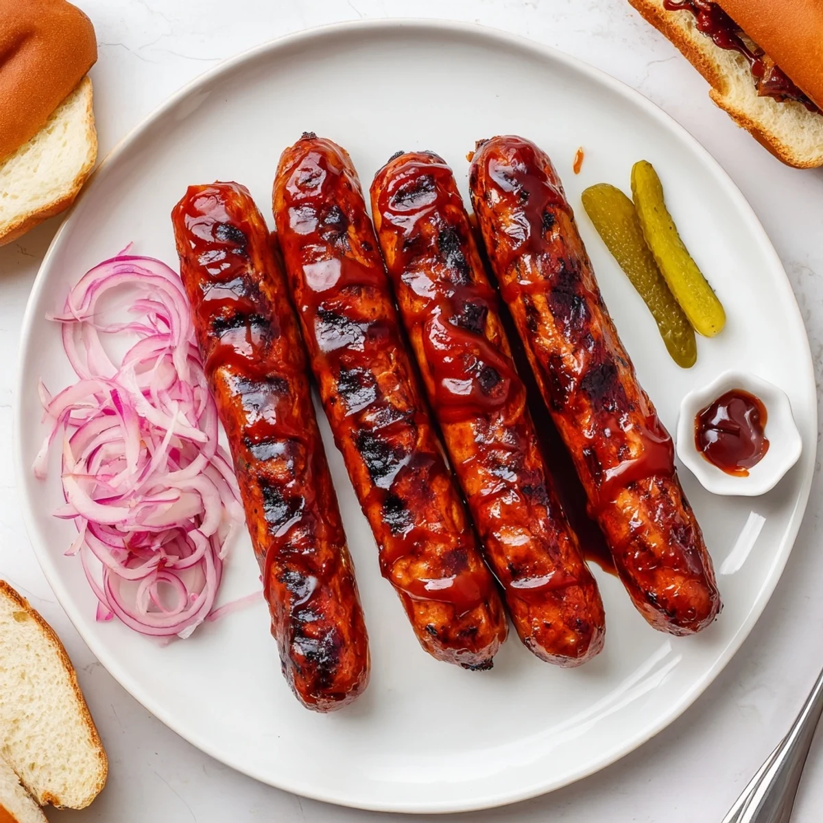 Grill over medium heat for about 10–12 minutes, turning frequently to brown evenly. Brush with the barbecue glaze during the final 5 minutes to build a glossy, caramelized crust. Cook until the sausages are heated through and nicely charred on the outside.