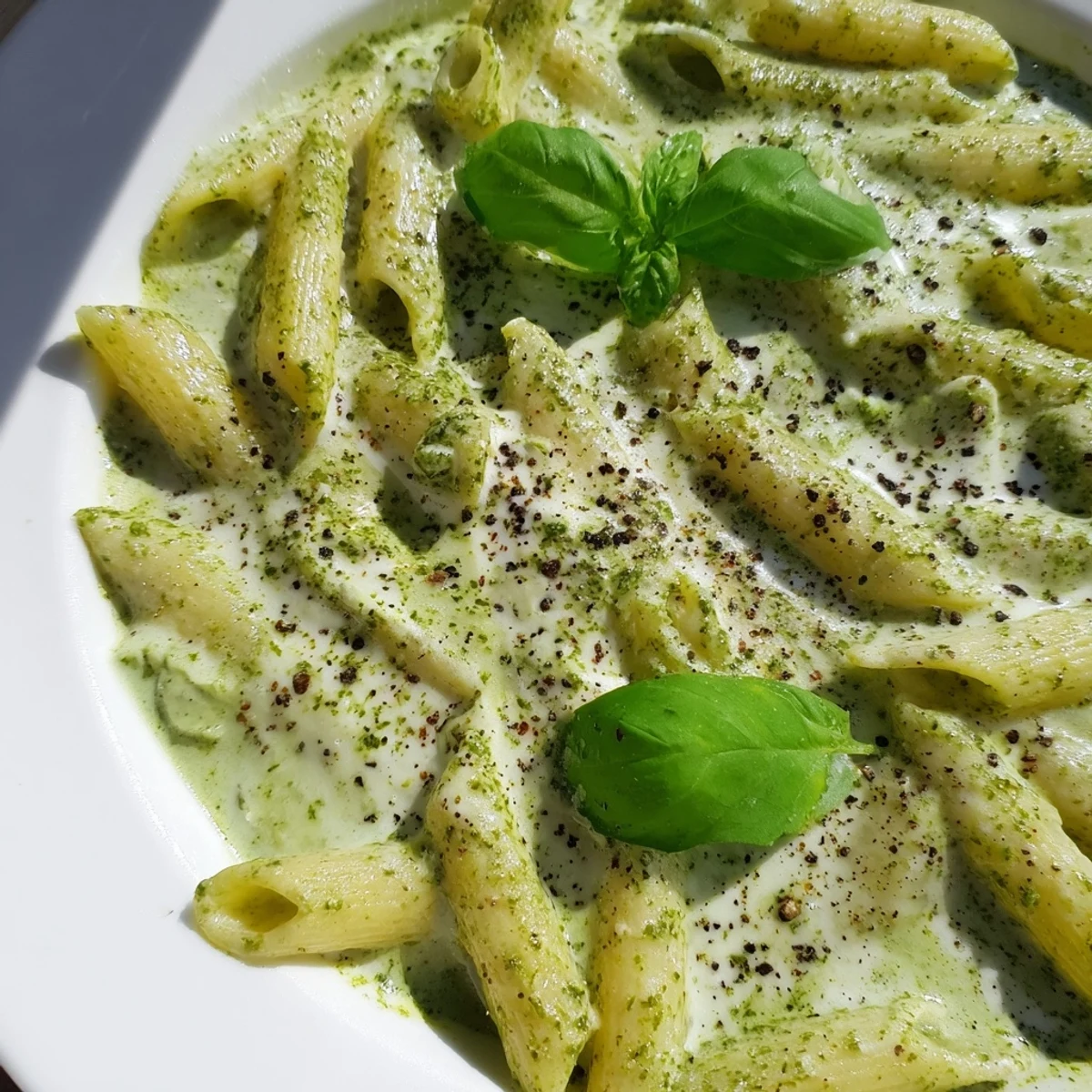 Penne and fettuccine are ideal choices as their textures hold the creamy sauce beautifully. Rotini, rigatoni, or fusilli also work well for catching the rich pesto coating.
