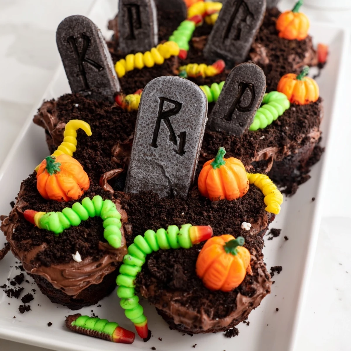 - Add gummy worms, candy pumpkins, or any Halloween candy around the tombstones. Chill 15 minutes to set everything.