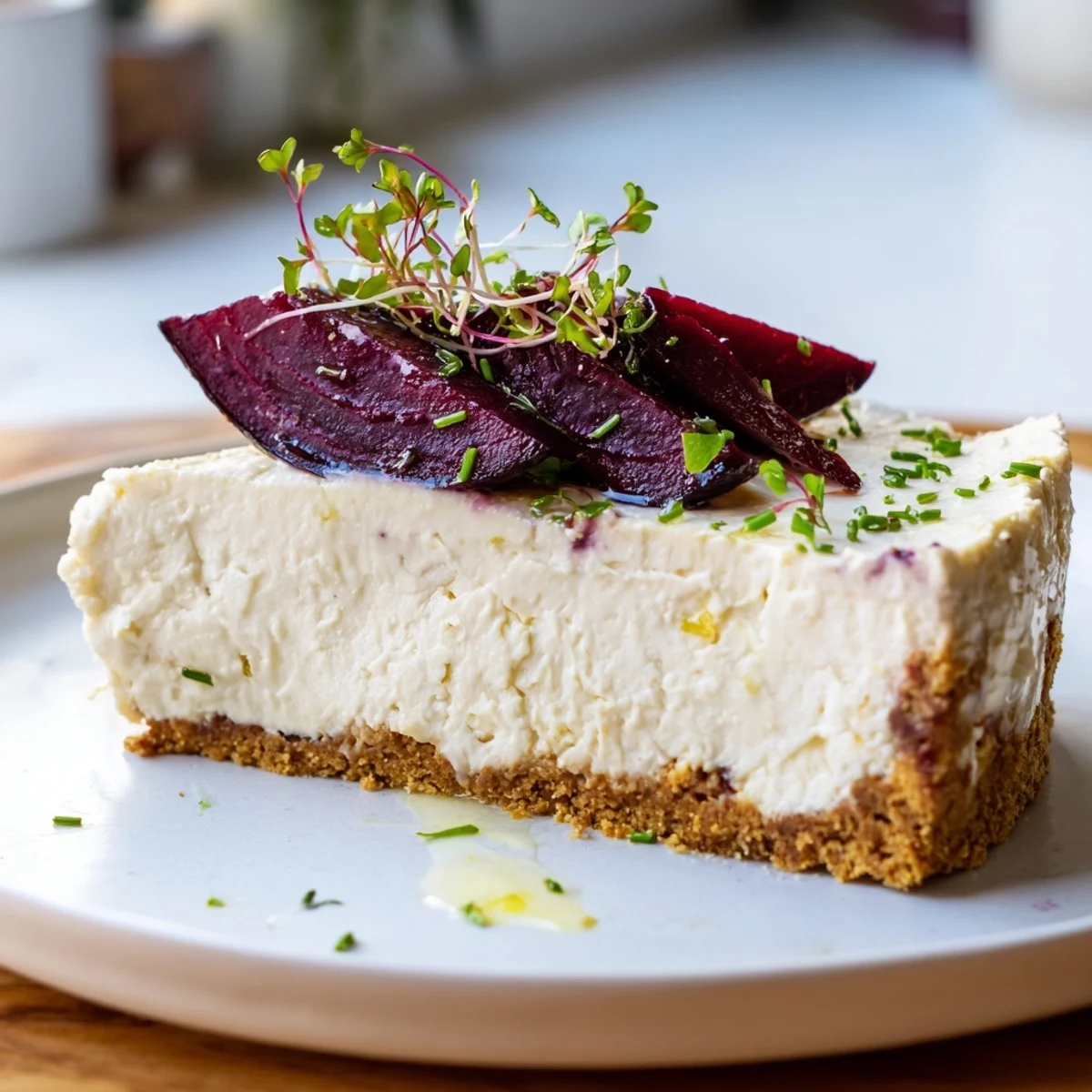 - Release cheesecake from the pan and arrange roasted beetroot wedges on top. Scatter with chives and microgreens, drizzle with good olive oil, and serve.