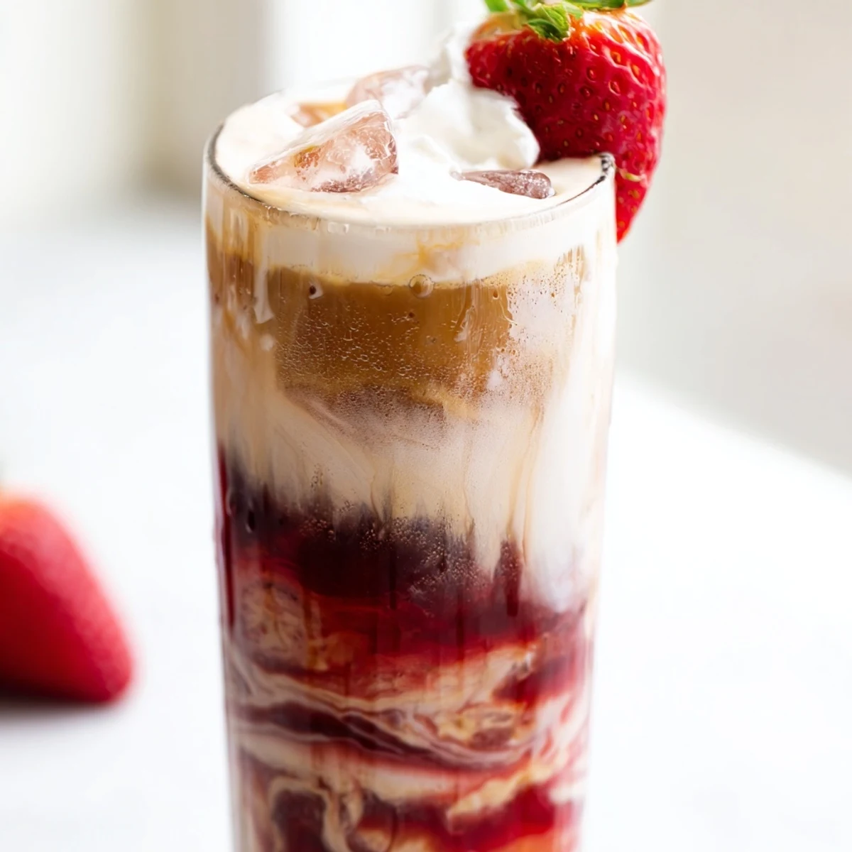 Pour the strawberry cream mixture over the ice first, then slowly drizzle the coffee over the back of a spoon held just above the liquid. This gentle pouring technique creates beautiful swirling layers.